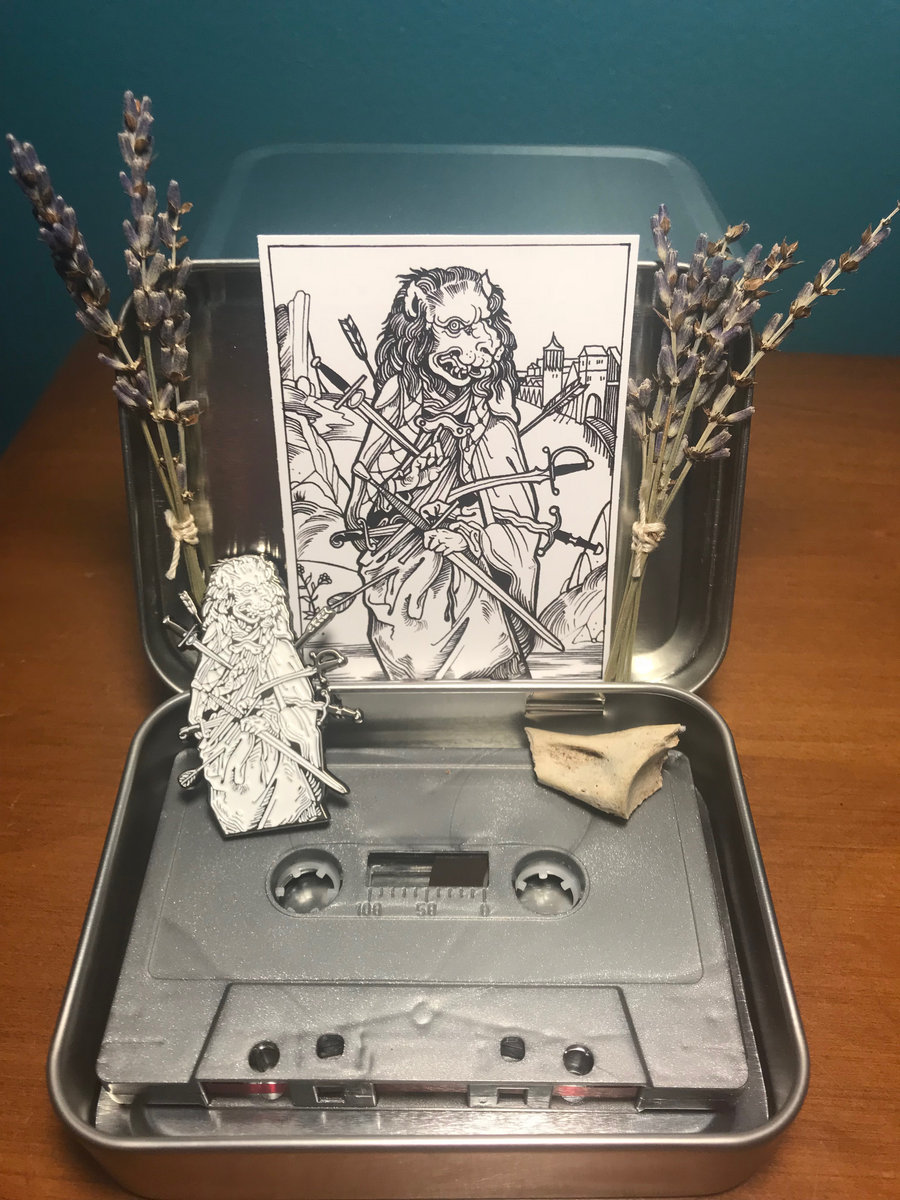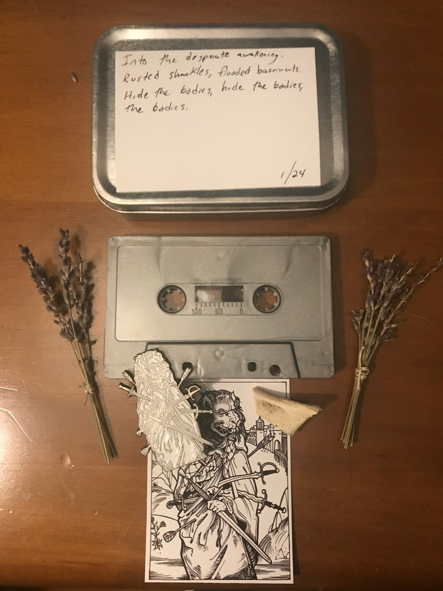 Deluxe version of "Decay and Other Hopes Against Progress" on CS. Silver cs housed inside a metal tin with: lavender bundles, home found and broken bones, unique lyric card, and an enamel pin of the cover art in a special colorway made only for the deluxe cassette (white on silver.)